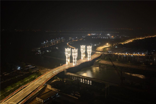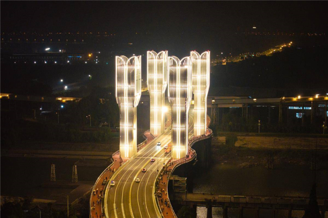 2025年11月8日晚,位于武汉市青山区的武汉首座升降桥——右岸大道开启桥灯火辉煌,4根桥梁升降立柱在夜幕中十分耀眼,吸引不少市民前来打卡拍照。10月31日,该桥正式试通车。这座横亘在武钢运河之上的大桥,是华中首座开启桥,桥梁可升降部分全长104米、提升桥面最宽达46.2米、最大可提升27米、提升重量2650吨,它巧妙地平衡了水路与陆路的交通需求。