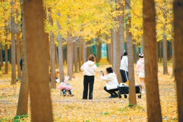漫步在银杏林中,脚下是厚厚的金色“地毯”,微风拂过,落叶纷飞,宛如童话世界。游客们或驻足拍照,或静坐小憩,尽情享受这份美景与惬意。(西安报业全媒体首席记者 翟小雪 摄)