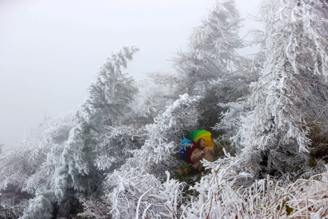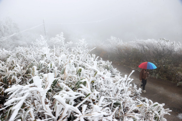 ▲11月18日,黔江区国家森林公园,游客在灰千梁子景区赏雪。特约摄影 杨敏