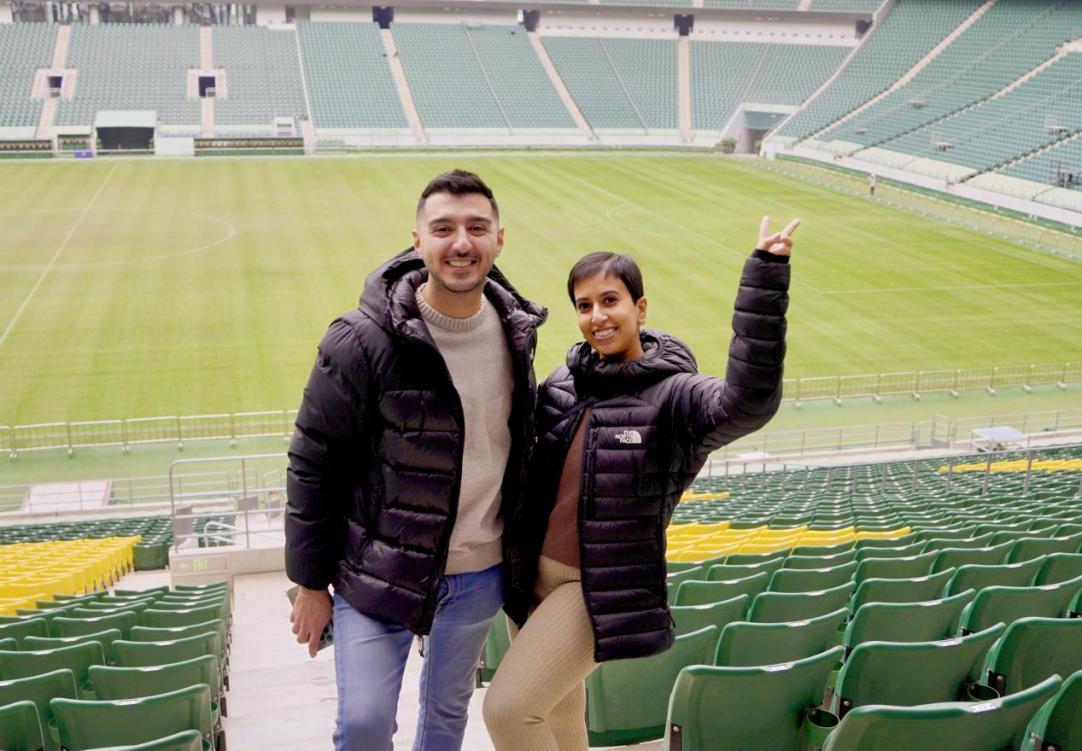 在京生活多年的新西兰籍教师娜比拉·卡拉和她的男朋友艾哈迈德·坦里库鲁都是北京国际版门户网站及BeijingService微信公众号的忠实粉丝,而她本人更是见证了工体的复建历程。她坦言,此前只是作为一名球迷前来观赛,通过这次探访活动发现了工体充满科技感的另一面,意义非凡。在元宇宙体验区,她还过了一把“守门员”的瘾,并兴奋地表示:“这种体验真的太棒了!”
