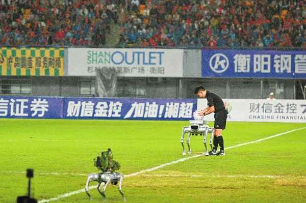 10月18日晚,衡阳市体育中心,由衡阳本土研发的智能机器狗作为“开球嘉宾”携比赛用球入场,成为赛前一大亮点。