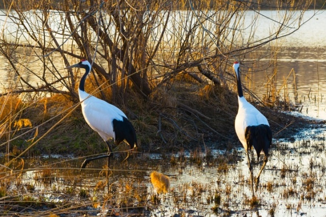 在生活习性上,丹顶鹤常成对或成家族群、小群活动,迁徙期和越冬期则会结成数十只甚至上百只的大群,但活动时仍以小群或家族为单位分散觅食。它们是杂食性鸟类,除了捕食水生生物,也会采食水生植物的种子、茎、叶,冬季还会到农田啄食谷物;休息时多单腿站立,将头转向后方插入背羽间,警惕性极高,一旦察觉危险便会腾空飞翔,鸣声高亢洪亮,可传至3至5千米外。值得一提的是,丹顶鹤实行严格的“一雄一雌制”,配偶关系可维持数十年,繁殖期会通过对鸣、舞蹈等行为求偶,巢多筑于水深5至25厘米的芦苇丛中,每窝产卵2枚,由雌雄亲鸟轮流孵化,雏鸟出壳后不久便能行走、游泳,生长速度较快。