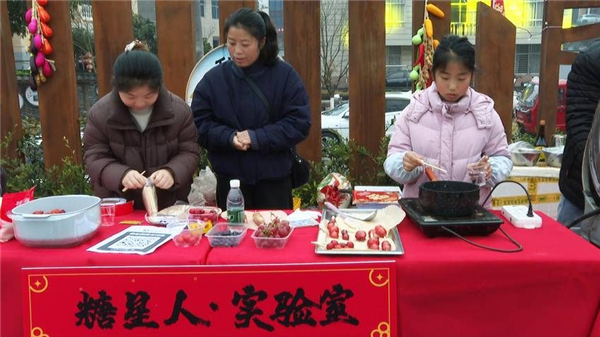 “果香糖甜·串福年”摊位前,邓雯璇小朋友正和家人一起将山楂串在竹签上,晶莹的糖浆在阳光下闪烁。“我要把这份甜蜜分享给同学!”她举着自制的糖葫芦笑道。