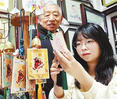 霍庆有孙女霍英琦(右一)设计的第一款年画元素文创挂饰。 记者 曹彤 摄